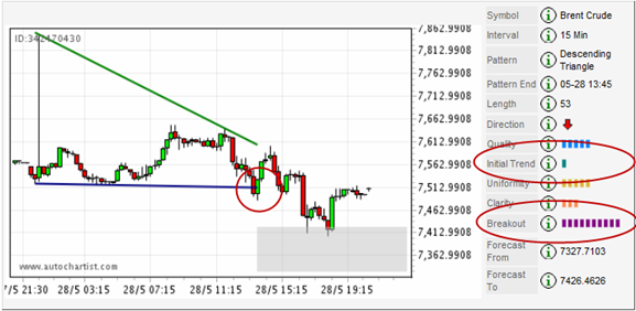 In the above pattern alert the Initial Trend reading is just one bar confirming a narrow, sideways accumulation cycle. The breakout through the Triangle pattern’s downtrend line resistance is seen here following through well from the consolidation of the pattern. The momentum the pattern broke with was moderate as indicated by the four bar Breakout reading. This is known as an Autochartist Initial Movement-Momentum or A.I.M. entry. Notice the high Breakout reading as well suggesting strong negative sentiment or selling momentum.